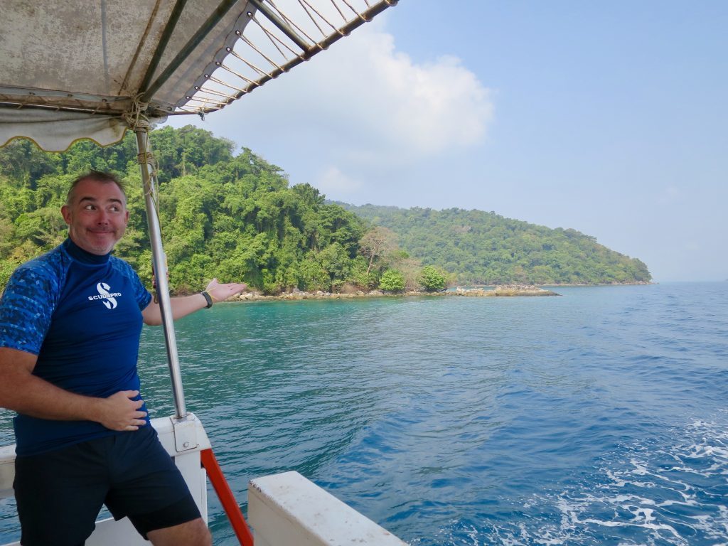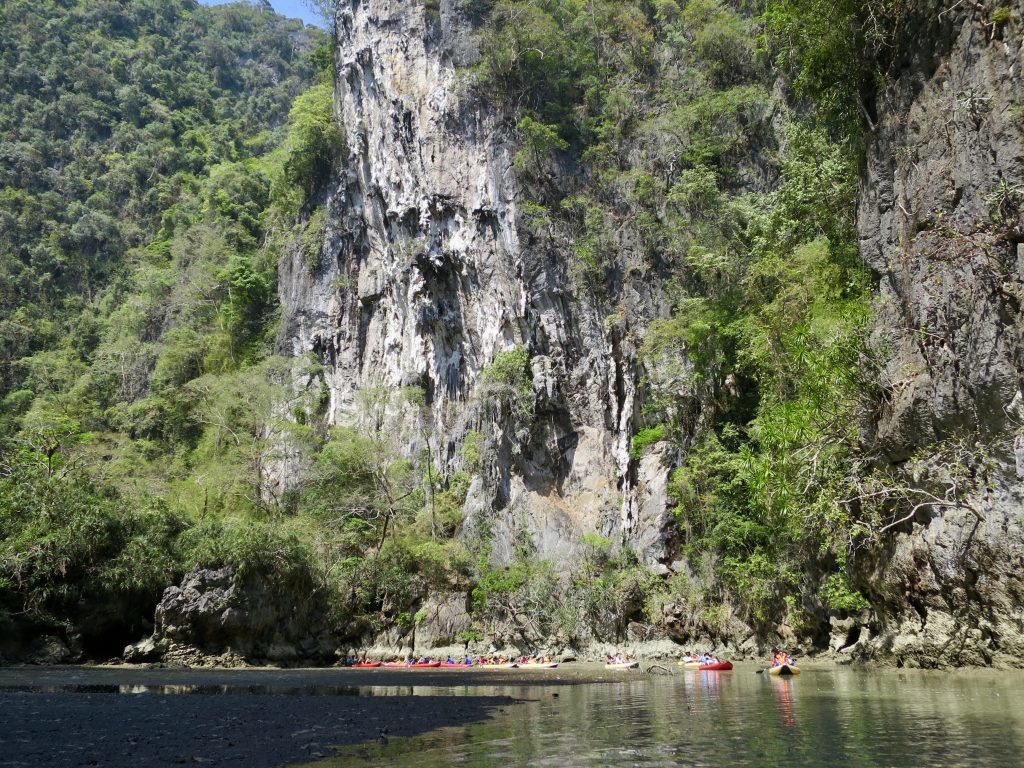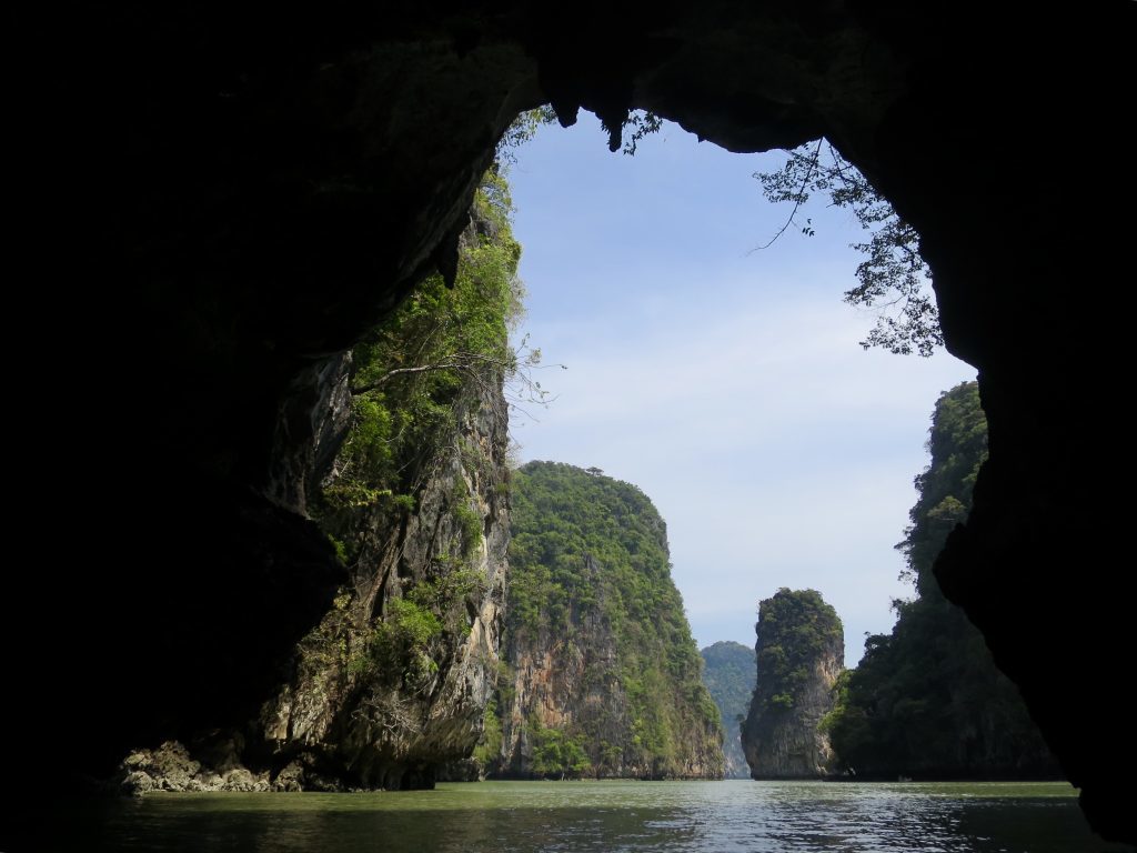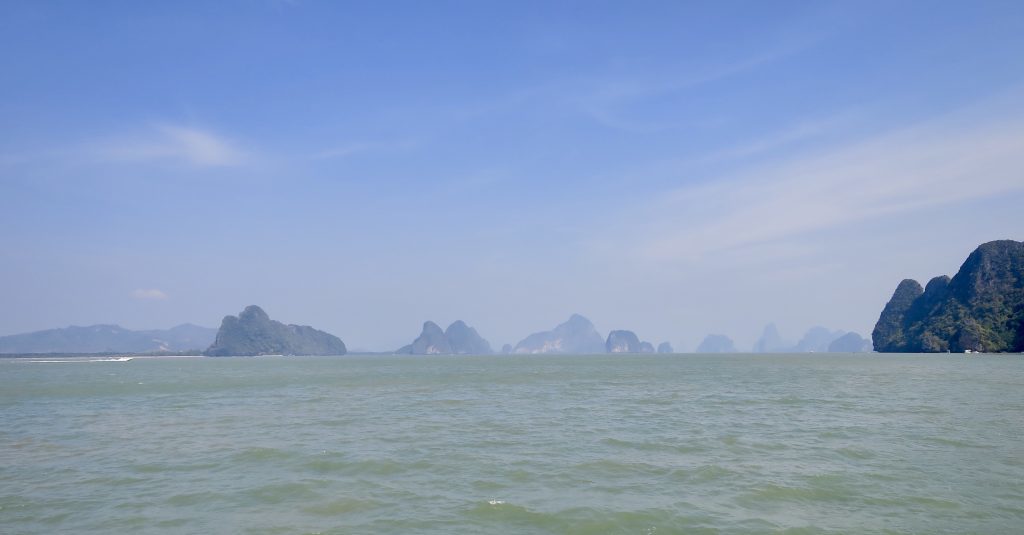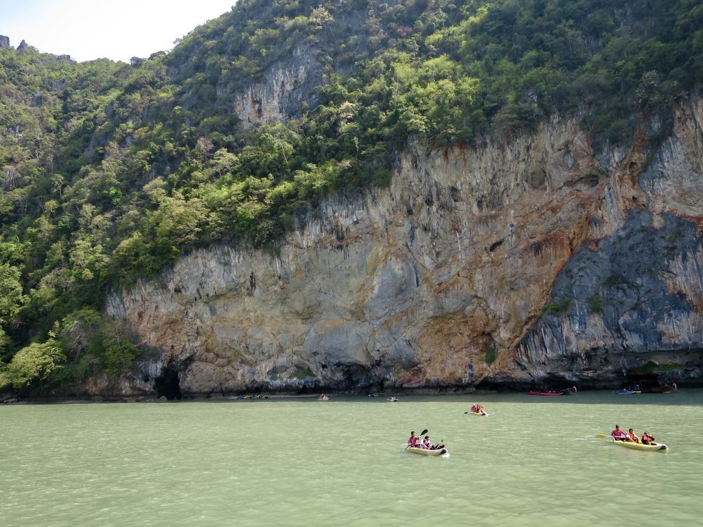 There are plenty of tours on offer all bookable locally with minimum one day notice so I chose one which included lunch, drinks, fruit and some sea kayaking too, all for 1,200Baht. A small minibus picked me up from the apartment and drove for about an hour or so picking up others along the way and we transferred to a boat. It was smooth voyage and the sea breeze was welcomed. Of in the distance and haze, you could see outlines of various mountain pinnacles rising out of the sea, but due to the haze playing tricks on your eyes, it often appeared as if you were seeing double.